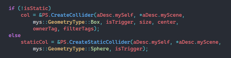 These different collider types can be easily created through the physics system, which acts as a middleman for PhysX functionality. This approach not only simplifies the interface and improves encapsulation, but also reduces compile time by enabling forward declaration.