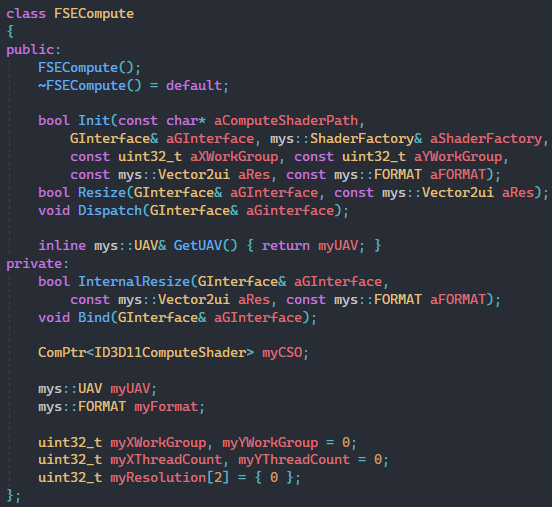 We had already implemented a fullscreen effect solution for some time, but when I began working on incorporating the compute shader, I realized that creating a computed fullscreen effect wrapper that was easy to use would be a beneficial addition. Both for performance and also for the easy-to-use tool that the rest of the programmers could utilize.
