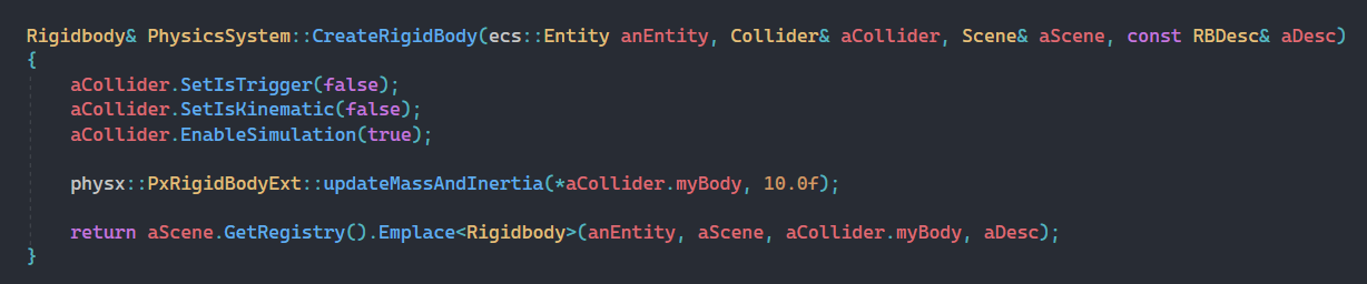 My primary focus when beginning work with PhysX was to ensure that the team could easily utilize it. To achieve this goal, I looked at how Unity had implemented its interpretation of physics objects and aimed to replicate that approach. Since the designers had primarily worked with Unity during previous projects, I wanted to create a seamless transition for them.